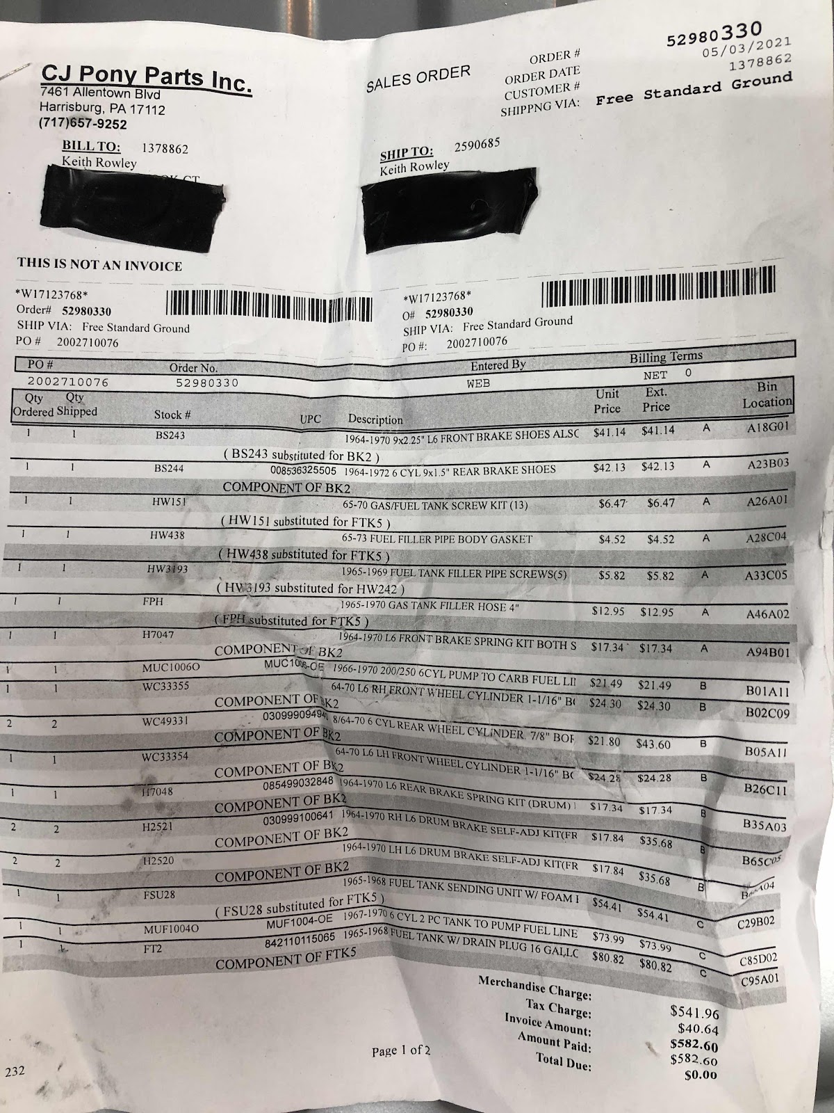I ordered fuel system and brake rebuild parts from CJ Pony Parts.